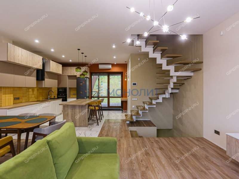 Второй этаж представляет собой просторную кухню-гостиную, полностью меблированную современной качественной мебелью с бытовой техникой. Там же находится гостевой сан.узел и выход на террасу.
