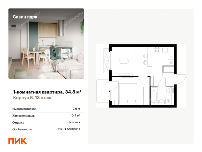 Продаётся 1-комн.квартира площадью 34.80 кв.м на 13 этаже 15 этажного дома (Корпус 6, секция 1) проекта ПИК Савин парк. Светлый просторный подъезд на уровне земли, функциональная планировка, большие окна, с отделкой. <br> <br>Жилой квартал «Савин парк» возводится в Кстовском муниципальном районе, рядом с Советским районом Нижнего Новгорода. До центра Нижнего Новгорода всего 20 минут на автомобиле, а до города Кстово — 18 минут. <br> <br>В этом проекте есть всё для комфортной жизни. Кроме жилых домов , проект включает два детских сада, один из которых уже строится, школу и многоуровневые надземные паркинги. На первых этажах откроются кафе, магазины и другие сервисы — чтобы купить кофе к завтраку или пиццу на ужин, можно будет просто спуститься на лифте. На подземном этаже появятся кладовые, в которых удобно хранить крупные и сезонные вещи. <br> <br>Чтобы жители квартала чувствовали простор и получали больше солнечного света, мы построим дома разной высоты. Во дворах появятся уютные парки с детскими площадками и местами для отдыха — здесь можно поболтать с соседями, почитать в тени или позаниматься йогой. Спортивные площадки мы разместим так, чтобы шум от них не мешал жителям. <br> <br>В квартирах тоже будет много солнечного света за счёт балконов и больших окон. На выбор есть множество функциональных планировок, все они продуманы так, чтобы как можно большая площадь использовалась для жизни. Вы получите ключи от квартиры с уже готовой отделкой — можно заезжать и жить. <br> <br>На машине от «Савин парка» можно доехать до ТРЦ «МЕГА» за 7 минут, за 14 минут — до Анкудиновского леса, а за 20 — до «Щёлоковского хутора». Артикул - 952651