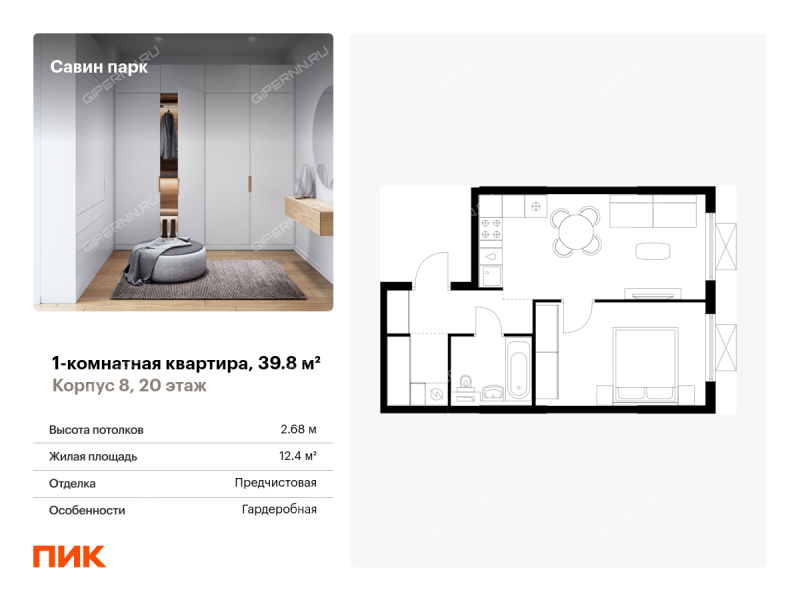 Продаётся 1-комн.квартира площадью 39.80 кв.м на 20 этаже 25 этажного дома (Корпус 8, секция 1) проекта ПИК Савин парк. Светлый просторный подъезд на уровне земли, функциональная планировка, большие окна, с отделкой. <br> <br>Жилой квартал «Савин парк» возводится в Кстовском муниципальном районе, рядом с Советским районом Нижнего Новгорода. До центра Нижнего Новгорода всего 20 минут на автомобиле, а до города Кстово — 18 минут. <br> <br>В этом проекте есть всё для комфортной жизни. Кроме жилых домов , проект включает два детских сада, один из которых уже строится, школу и многоуровневые надземные паркинги. На первых этажах откроются кафе, магазины и другие сервисы — чтобы купить кофе к завтраку или пиццу на ужин, можно будет просто спуститься на лифте. На подземном этаже появятся кладовые, в которых удобно хранить крупные и сезонные вещи. <br> <br>Чтобы жители квартала чувствовали простор и получали больше солнечного света, мы построим дома разной высоты. Во дворах появятся уютные парки с детскими площадками и местами для отдыха — здесь можно поболтать с соседями, почитать в тени или позаниматься йогой. Спортивные площадки мы разместим так, чтобы шум от них не мешал жителям. <br> <br>В квартирах тоже будет много солнечного света за счёт балконов и больших окон. На выбор есть множество функциональных планировок, все они продуманы так, чтобы как можно большая площадь использовалась для жизни. Вы получите ключи от квартиры с уже готовой отделкой — можно заезжать и жить. <br> <br>На машине от «Савин парка» можно доехать до ТРЦ «МЕГА» за 7 минут, за 14 минут — до Анкудиновского леса, а за 20 — до «Щёлоковского хутора». Артикул - 985817