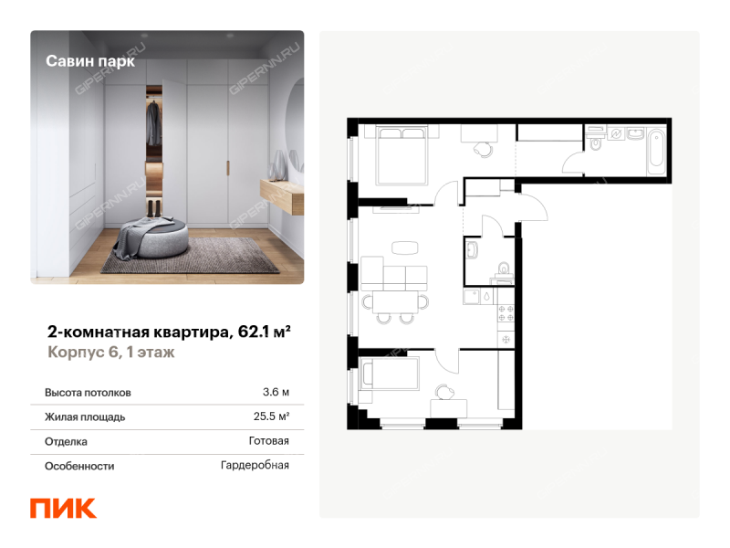 Продаётся 2-комн.квартира площадью 62.10 кв.м на 1 этаже 15 этажного дома (Корпус 6, секция 1) проекта ПИК Савин парк. Светлый просторный подъезд на уровне земли, функциональная планировка, большие окна, с отделкой. <br> <br>Жилой квартал «Савин парк» возводится в Кстовском муниципальном районе, рядом с Советским районом Нижнего Новгорода. До центра Нижнего Новгорода всего 20 минут на автомобиле, а до города Кстово — 18 минут. <br> <br>В этом проекте есть всё для комфортной жизни. Кроме жилых домов , проект включает два детских сада, один из которых уже строится, школу и многоуровневые надземные паркинги. На первых этажах откроются кафе, магазины и другие сервисы — чтобы купить кофе к завтраку или пиццу на ужин, можно будет просто спуститься на лифте. На подземном этаже появятся кладовые, в которых удобно хранить крупные и сезонные вещи. <br> <br>Чтобы жители квартала чувствовали простор и получали больше солнечного света, мы построим дома разной высоты. Во дворах появятся уютные парки с детскими площадками и местами для отдыха — здесь можно поболтать с соседями, почитать в тени или позаниматься йогой. Спортивные площадки мы разместим так, чтобы шум от них не мешал жителям. <br> <br>В квартирах тоже будет много солнечного света за счёт балконов и больших окон. На выбор есть множество функциональных планировок, все они продуманы так, чтобы как можно большая площадь использовалась для жизни. Вы получите ключи от квартиры с уже готовой отделкой — можно заезжать и жить. <br> <br>На машине от «Савин парка» можно доехать до ТРЦ «МЕГА» за 7 минут, за 14 минут — до Анкудиновского леса, а за 20 — до «Щёлоковского хутора». Артикул - 952518