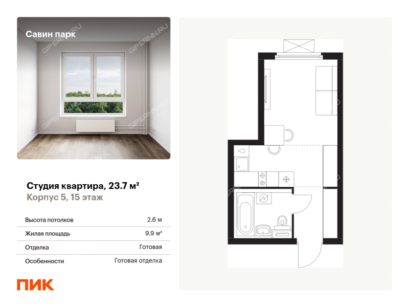 Продаётся квартира-студия площадью 23.70 кв.м на 15 этаже 15 этажного дома (Корпус 5, секция 1) проекта ПИК Савин парк. Светлый просторный подъезд на уровне земли, функциональная планировка, большие окна, с отделкой. <br> <br> <br>Жилой квартал «Савин парк» возводится в Кстовском муниципальном районе, рядом с Советским районом Нижнего Новгорода. До центра Нижнего Новгорода всего 20 минут на автомобиле, а до города Кстово — 18 минут. <br> <br>В этом проекте есть всё для комфортной жизни. Кроме жилых домов , проект включает два детских сада, один из которых уже строится, школу и многоуровневые надземные паркинги. На первых этажах откроются кафе, магазины и другие сервисы — чтобы купить кофе к завтраку или пиццу на ужин, можно будет просто спуститься на лифте. На подземном этаже появятся кладовые, в которых удобно хранить крупные и сезонные вещи. <br> <br>Чтобы жители квартала чувствовали простор и получали больше солнечного света, мы построим дома разной высоты. Во дворах появятся уютные парки с детскими площадками и местами для отдыха — здесь можно поболтать с соседями, почитать в тени или позаниматься йогой. Спортивные площадки мы разместим так, чтобы шум от них не мешал жителям. <br> <br>В квартирах тоже будет много солнечного света за счёт балконов и больших окон. На выбор есть множество функциональных планировок, все они продуманы так, чтобы как можно большая площадь использовалась для жизни. Вы получите ключи от квартиры с уже готовой отделкой — можно заезжать и жить. <br> <br>На машине от «Савин парка» можно доехать до ТРЦ «МЕГА» за 7 минут, за 14 минут — до Анкудиновского леса, а за 20 — до «Щёлоковского хутора». Цена действует при оплате наличными. подробности по телефону. Артикул - 952502