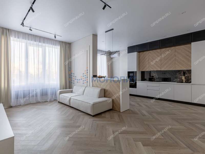• Общая площадь 91 м². Эргономика планировки делит пространство на две спальни на обе стороны дома, кухня-гостиная 45 м², санузел с встроенной ванной. Выполнено обустройство квартиры мебелью, изготовленной на заказ, и полная комплектация техникой.