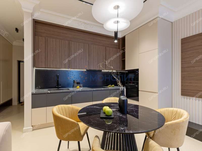 Эргономично разместились две спальни: детская 18.4 м² с лоджией, спальня 15.3 м²; кухня-гостиная 22 м² с выходом на вторую лоджию; два санузла: гостевой с душем и личный с ванной. Обустройство квартиры мебелью, выполненной на заказ, и полная комплектация техникой.