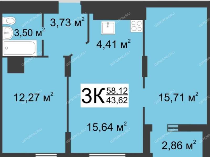 Общая площадь - 58,12 кв.м