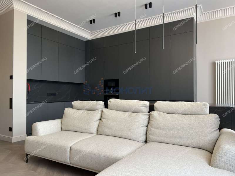 • Общая площадь 154 м². Эргономика планировки включает три спальни: мастер-спальня с гардеробной 28.28 м²; две спальни 17.77 м² и 13.54 м² просторная кухня-столовая, совмещенная с гостиной 57 м² с выходом на лоджию. Обустройство квартиры мебелью, выполненной на заказ, и полная комплектация техникой.