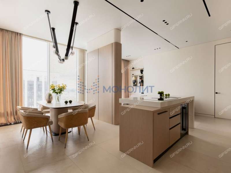 • В квартире имеется: гостиная, кухня-столовая с обеденной зоной и островом; общая гардеробная в коридоре; две мастер-спальни с личной гардеробной и санузлом; детская спальня, дополнительный гостевой санузел. Панорамное остекление во всей квартире позволяет дизайну раскрываться натурально-светлой, окутывающей гаммой.