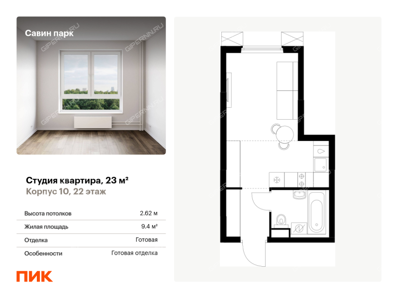 Продаётся квартира-студия площадью 23.00 кв.м на 22 этаже 25 этажного дома (Корпус 10, секция 1) проекта ПИК Савин парк. Светлый просторный подъезд на уровне земли, функциональная планировка, большие окна, с отделкой. <br> <br>Жилой квартал «Савин парк» возводится в Кстовском муниципальном районе, рядом с Советским районом Нижнего Новгорода. До центра Нижнего Новгорода всего 20 минут на автомобиле, а до города Кстово — 18 минут. <br> <br>В этом проекте есть всё для комфортной жизни. Кроме жилых домов , проект включает два детских сада, один из которых уже строится, школу и многоуровневые надземные паркинги. На первых этажах откроются кафе, магазины и другие сервисы — чтобы купить кофе к завтраку или пиццу на ужин, можно будет просто спуститься на лифте. На подземном этаже появятся кладовые, в которых удобно хранить крупные и сезонные вещи. <br> <br>Чтобы жители квартала чувствовали простор и получали больше солнечного света, мы построим дома разной высоты. Во дворах появятся уютные парки с детскими площадками и местами для отдыха — здесь можно поболтать с соседями, почитать в тени или позаниматься йогой. Спортивные площадки мы разместим так, чтобы шум от них не мешал жителям. <br> <br>В квартирах тоже будет много солнечного света за счёт балконов и больших окон. На выбор есть множество функциональных планировок, все они продуманы так, чтобы как можно большая площадь использовалась для жизни. Вы получите ключи от квартиры с уже готовой отделкой — можно заезжать и жить. <br> <br>На машине от «Савин парка» можно доехать до ТРЦ «МЕГА» за 7 минут, за 14 минут — до Анкудиновского леса, а за 20 — до «Щёлоковского хутора». Артикул - 970275