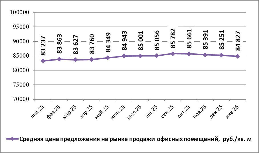 По данным Gipernn.ru на рынке продажи офисных помещений Нижнего Новгорода в январе 2026 года средняя цена предложения составила 84 827,08 руб./кв.м. По сравнению с предыдущим месяцем она понизилась на 0,50%.
