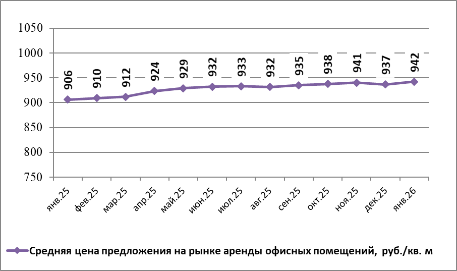 По данным Gipernn.ru на рынке аренды офисных помещений Нижнего Новгорода в январе 2026 года средняя цена предложения составила 942,37 руб./кв.м. По сравнению с предыдущим месяцем она повысилась на 0,61%.