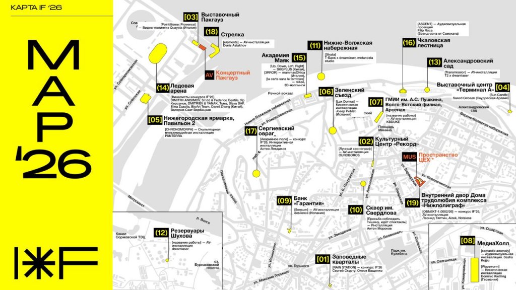 Известные здания и пространства Нижнего Новгорода станут площадками для масштабного фестиваля мультимедийного искусства INTERVALS-2026 (0+). Карту из 23 локаций опубликовали организаторы события.