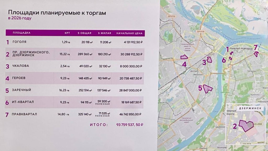 Также на торги в 2026 году повторно выставят масштабную территорию в районе проспекта Дзержинского в Дзержинске. На 15,22 га может появиться 289 360 кв. м нового строительства, в том числе 180 210 кв.м жилья. Стартовая цена площадки в городе химиков — 30,3 млн рублей.