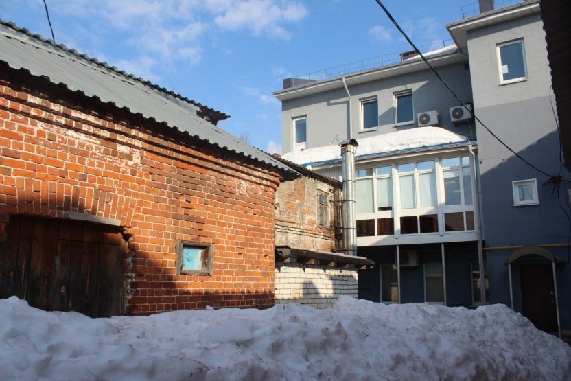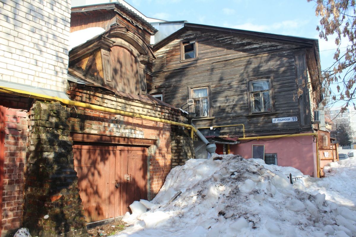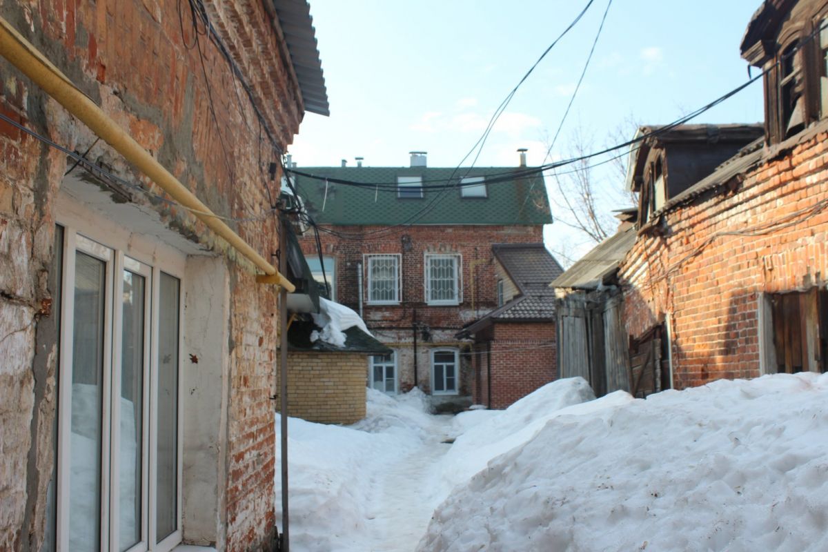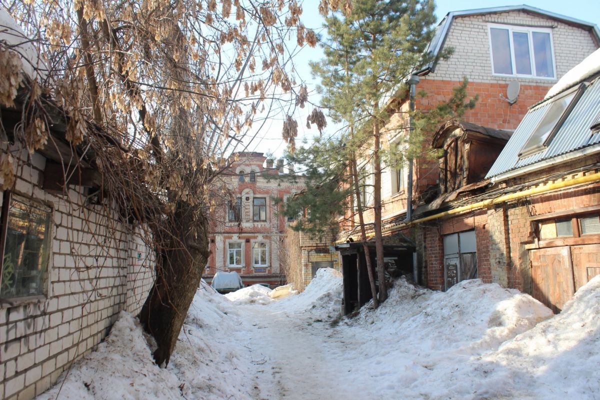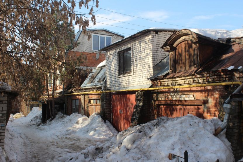 Сейчас эта часть территории застроена более плотно, особенно со стороны улицы Ильинской. Здесь можно затеряться в череде внутренних дворов, путь к которым идет через арки и узкие проезды. В этих дворах словно живет дух старого купеческого города, а в одном прячется каретный сарай. В соседнем мы заметили не менее интересную хозяйственную постройку, а еще — сосну, которая уже несколько лет растет в необычных для таких деревьев условиях.