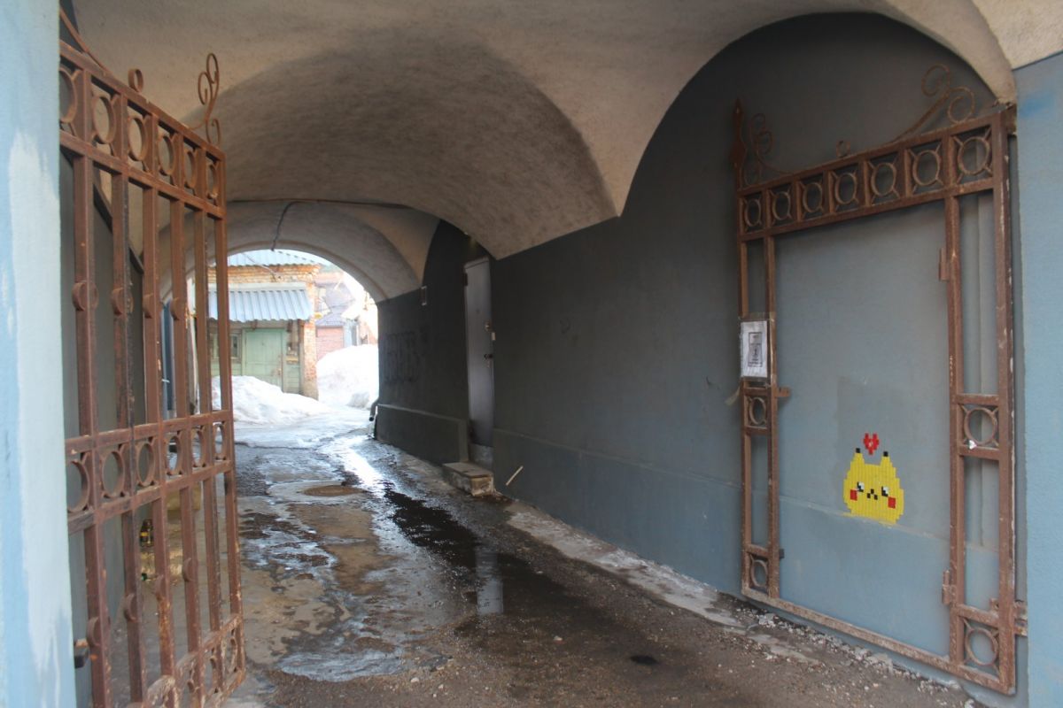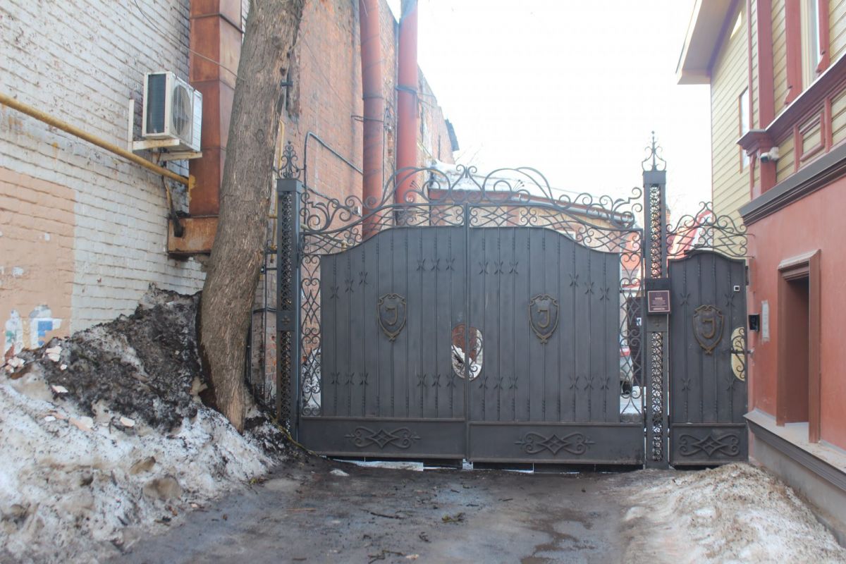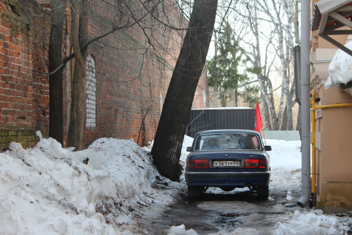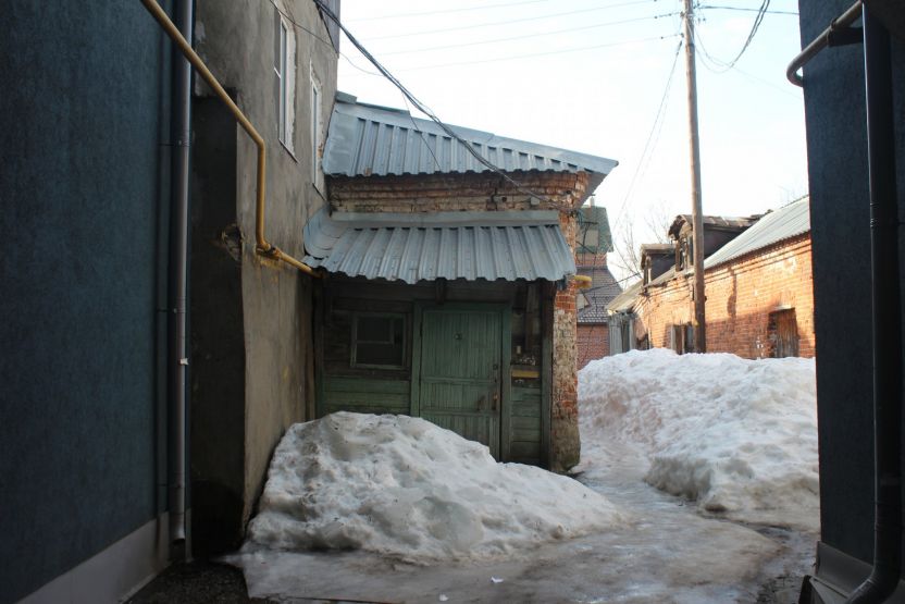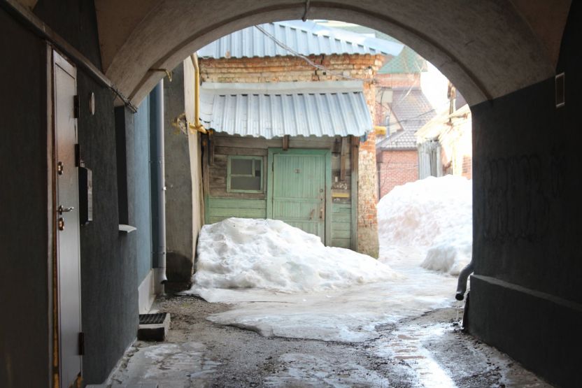 Сейчас эта часть территории застроена более плотно, особенно со стороны улицы Ильинской. Здесь можно затеряться в череде внутренних дворов, путь к которым идет через арки и узкие проезды. В этих дворах словно живет дух старого купеческого города, а в одном прячется каретный сарай. В соседнем мы заметили не менее интересную хозяйственную постройку, а еще — сосну, которая уже несколько лет растет в необычных для таких деревьев условиях.