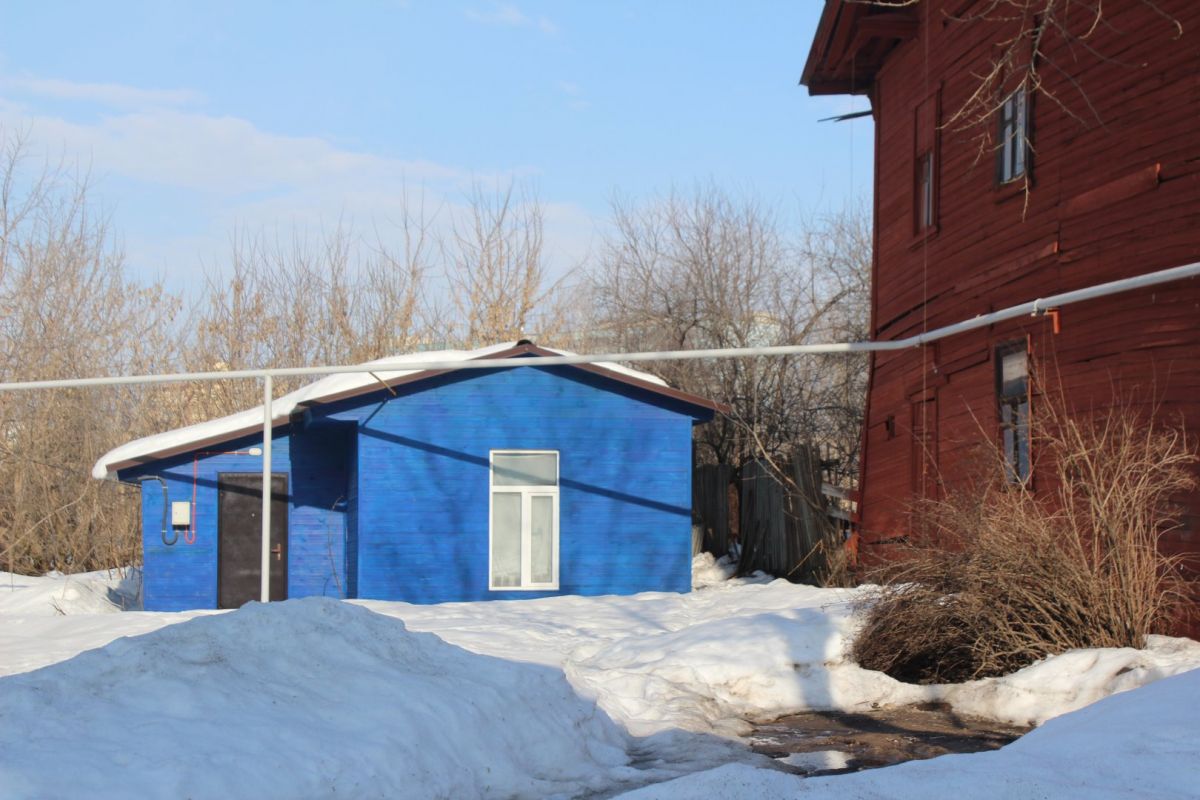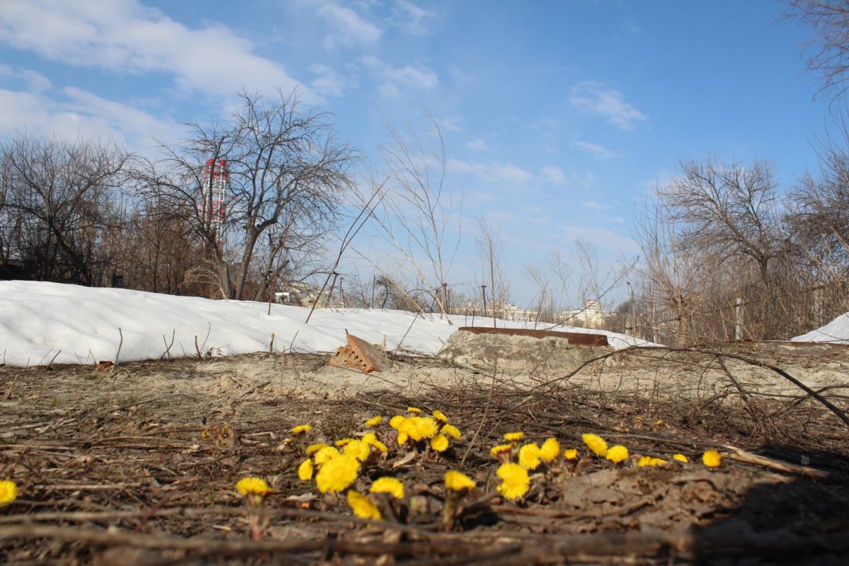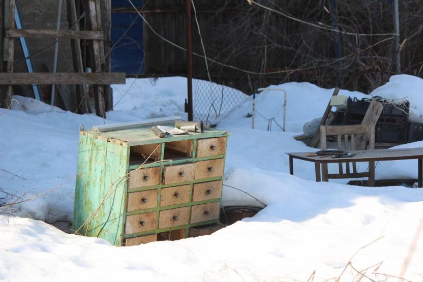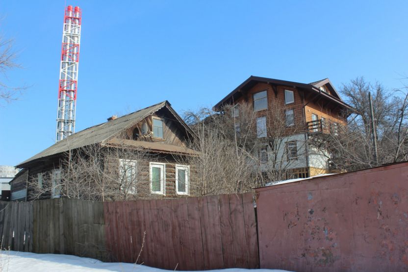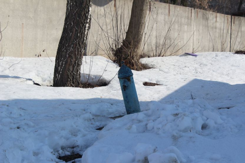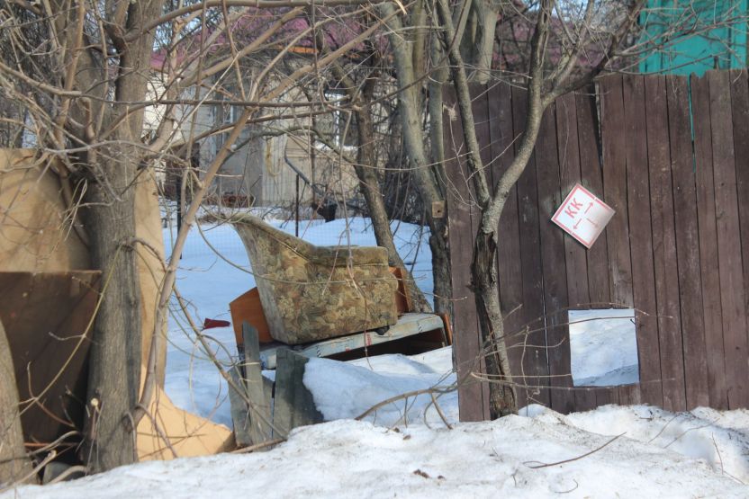 Во дворе этих двух домов все напоминает о старом укладе жизни. Есть колонка, к которой протоптана тропа: сюда люди ходят за водой. За двухэтажкой с эркером можно увидеть старую мебель и скворечник. А еще здесь проходит теплотрасса, над которой цветет первая в городе мать-и-мачеха.