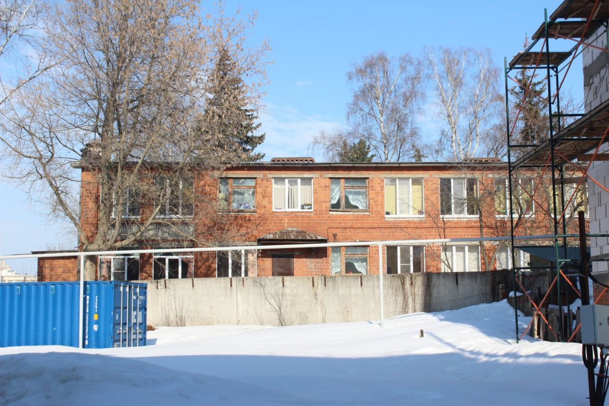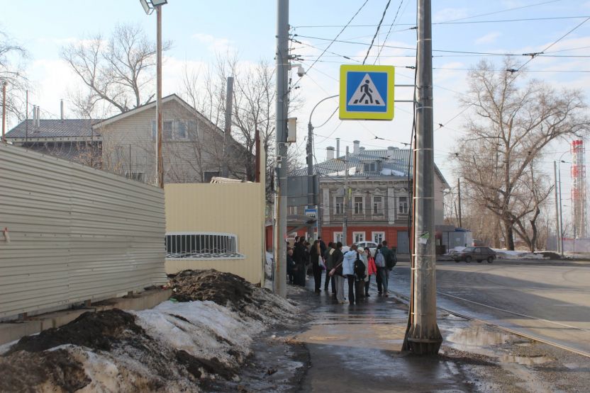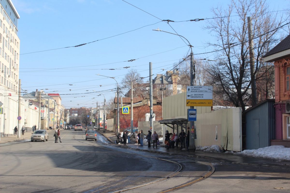 Вдоль улицы Маслякова остались в основном ветхие дома, которые сейчас реквизируют. Одно такое полуразрушенное здание находится прямо за трамвайной остановкой и огорожено забором.