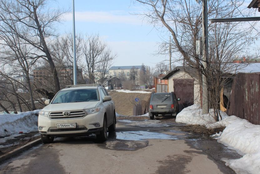 В саду возле Дома Панфиловой царит разруха. Само здание уже давно не кажется жилым, хотя рядом припаркованы машины. Водители привыкли оставлять свои автомобили вдоль склона, при этом на Больших Оврагах немало гаражей — в перспективе они пойдут под снос.