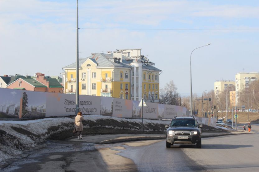 Архитектурную концепцию для технопарка, как и для «Неймарка», разрабатывало АБ «Студия 44». Сейчас вдоль улицы Маслякова тянется забор, на котором год назад появились визуализации перспективной застройки. Теперь яркие рендеры выгорели и покрылись пылью, но на них все еще видно запоминающийся образ города будущего.