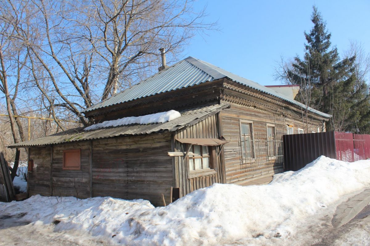 Двухэтажка № 17, которая возвышается над съездом на метромост, известна как памятник архитектуры «Дом Л.И. Панфиловой». Это здание признали аварийным и сейчас расселяют. Со стороны откоса дом выглядит крепким, но совсем другая картина открывается с бокового фасада: окна памятника заложены фанерой и кирпичом, местами отваливается отделка.