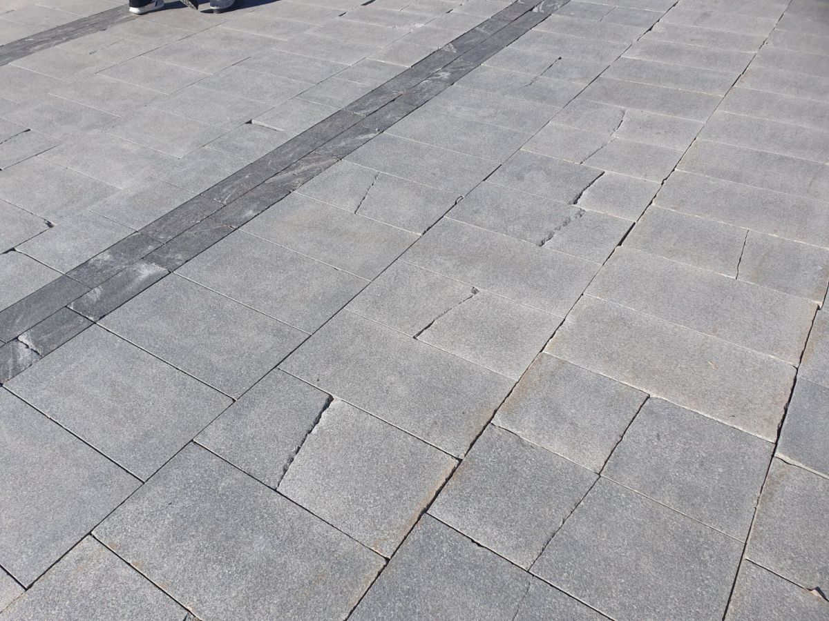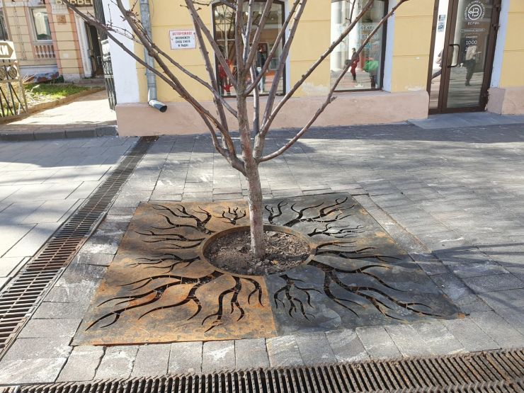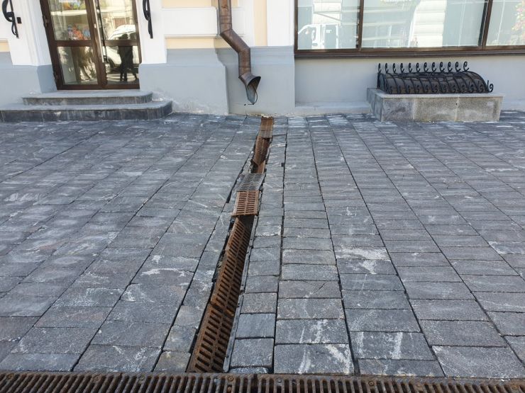 На Большой Покровской мы увидели множество сколов как по центру плиток, так и по краям. Местами покрытие пошло волнами — где-то вздулось, где-то провалилось, а где-то вовсе пропало. Некоторые решетки над водостоками провалились в желоб, захватив с собой часть брусчатки. Приствольные решетки вокруг молодых деревьев проржавели.