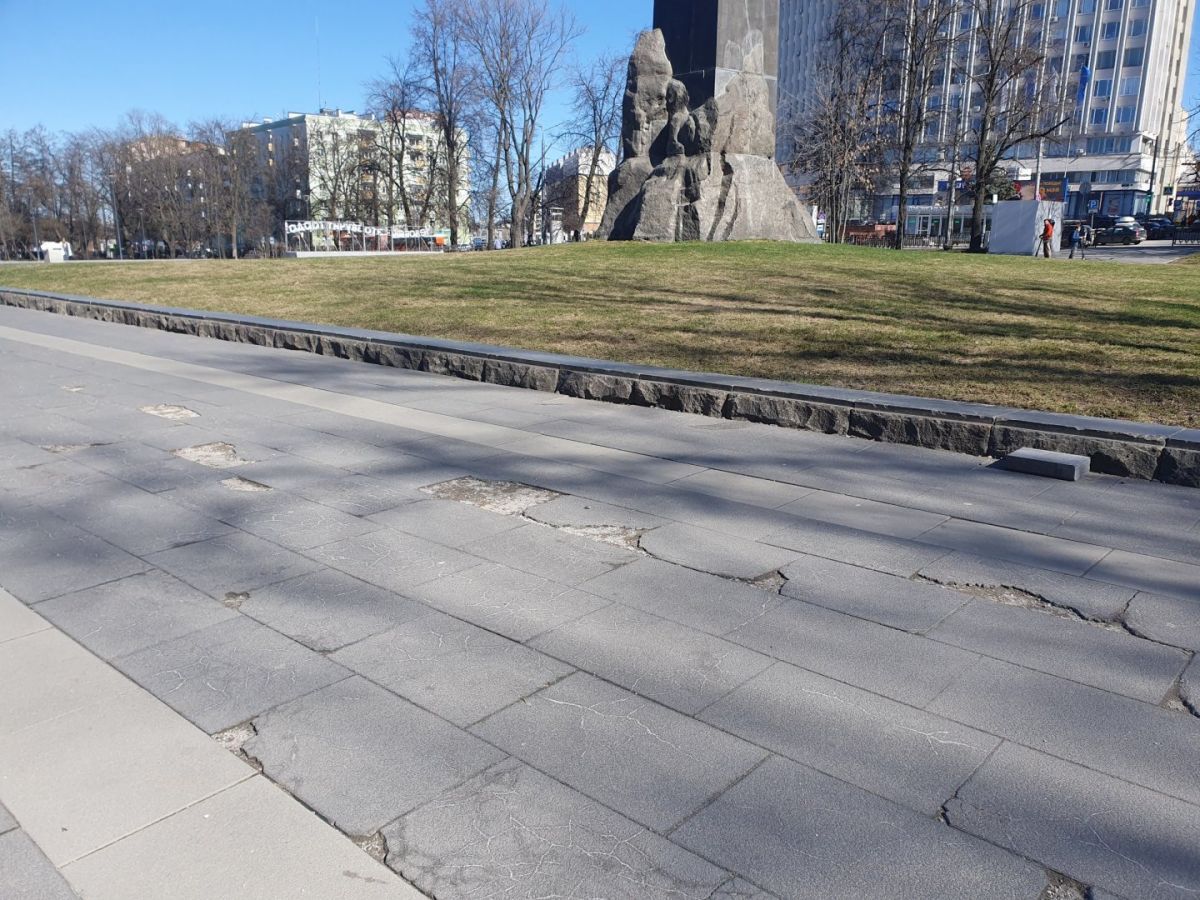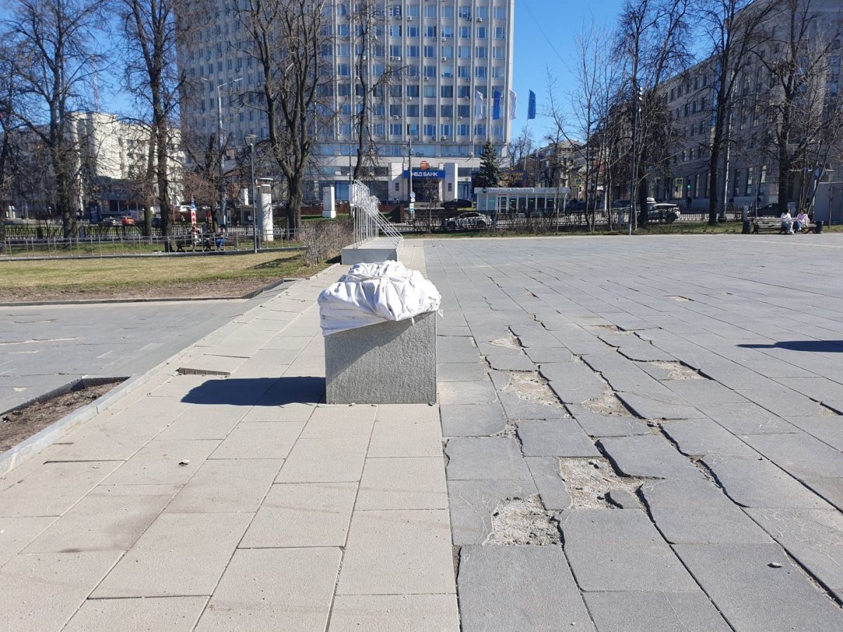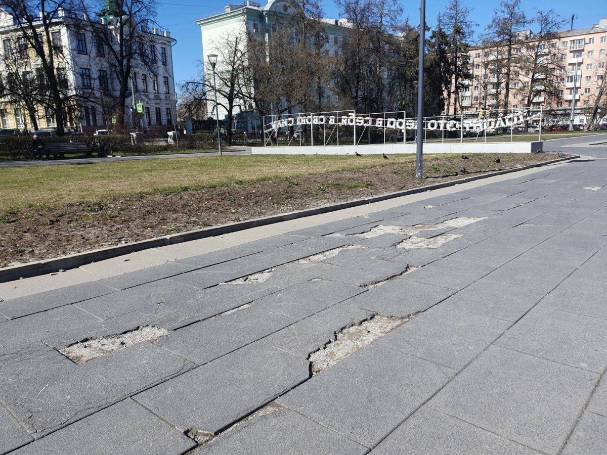 В сквере на площади Горького покрытие выглядит еще хуже — там буквально появились «дыры» отсутствующей плитки. Ее нет как на участках возле памятника, так и на дорожках между арт-объектами в виде цитат писателя. Также в сквере покосились ливневые колодцы, а бронзовый макет памятника Максиму Горькому остается сломанным. Зимой 2025 -го его в третий раз повредили вандалы.