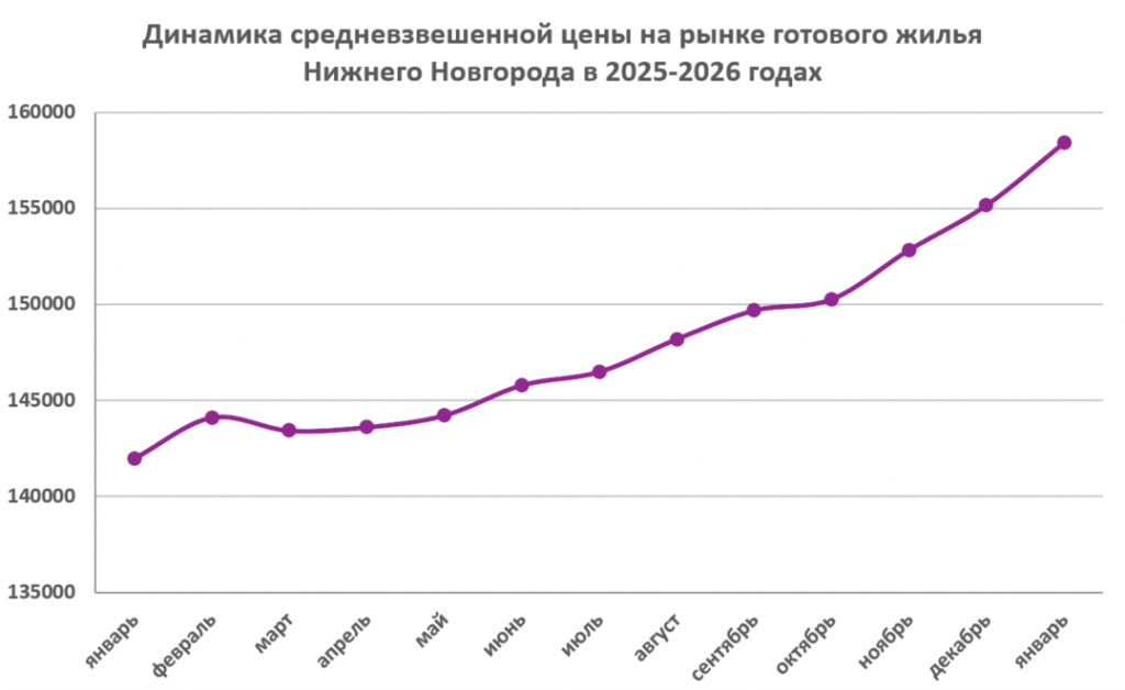 По итогам прошлого года цена предложения на рынке готового жилья в Нижнем Новгороде увеличилась на 10,5%. В декабре она достигла 155,2 тысячи рублей за «квадрат». А уже в первом месяце 2026 года единица площади подорожала еще на 3,24 тысячи.