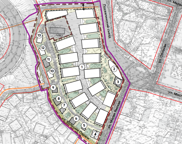Кроме того, в планах построить еще пять двухэтажных офисных зданий. Одно будет выходить на Похвалинский съезд и разместится рядом с ОКН «Жилой дом» (Малая Ямская, 3). Другие корпуса расположат вдоль улицы Большие Овраги. Здесь также планируется сохранить историческую застройку — памятники архитектуры № 5 и 17 и ценные градостроительные объекты № 11 и 13. Судя по графическим материалам, последний могут сдвинуть ближе к дороге.