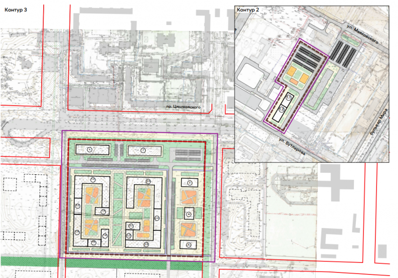 Второй незастроенный контур ограничен проспектом Циолковского и микрорайоном Западный-1. Тут построят пять домов: три 15- и 18-этажные свечки и две новостройки из нескольких корпусов высотой от 7 до 18 этажей. Для автомобилей предусмотрят две шестиэтажные парковки на 560 машино-мест.